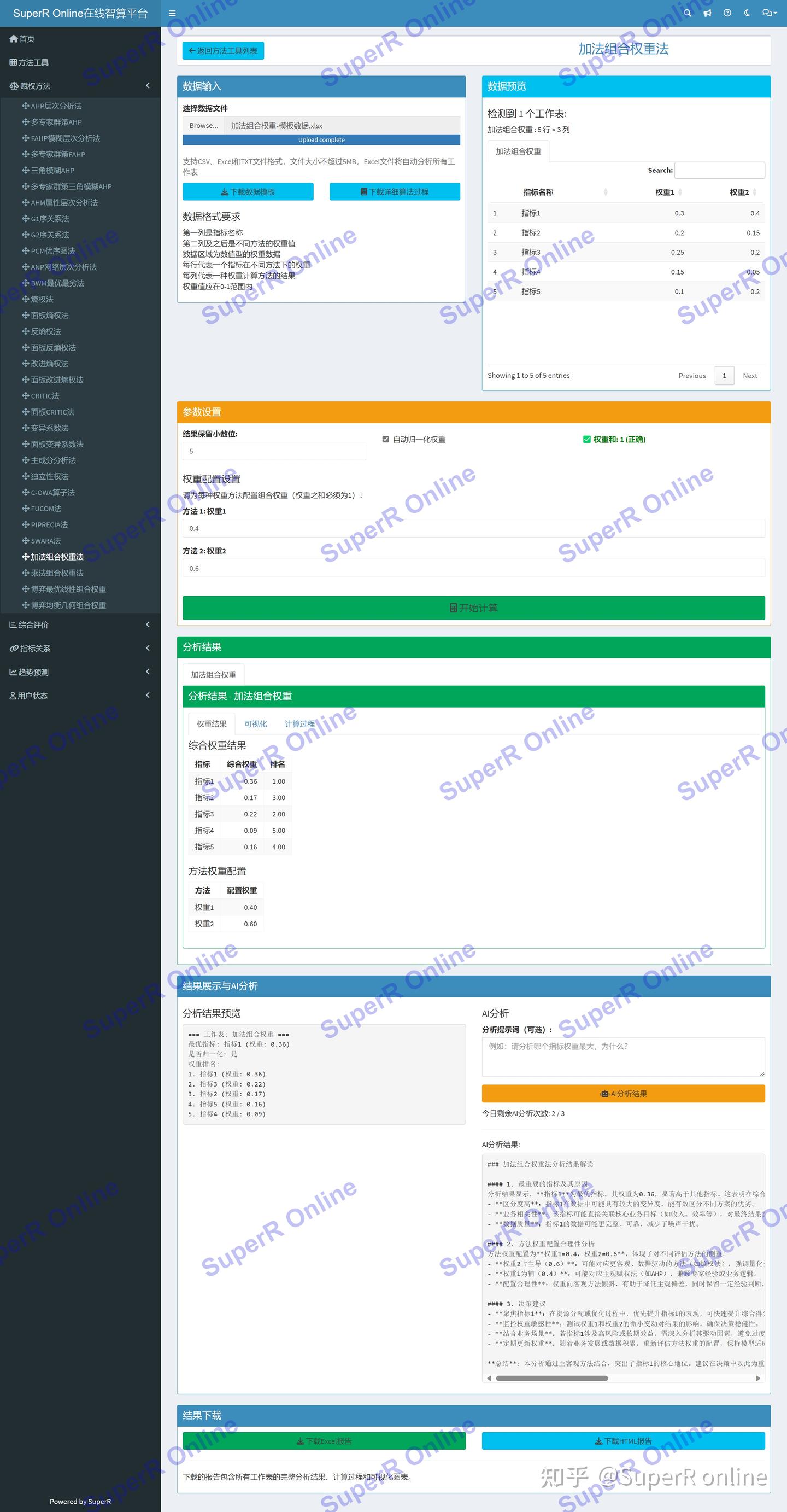 加法组合权重法分析平台提供以下核心功能: