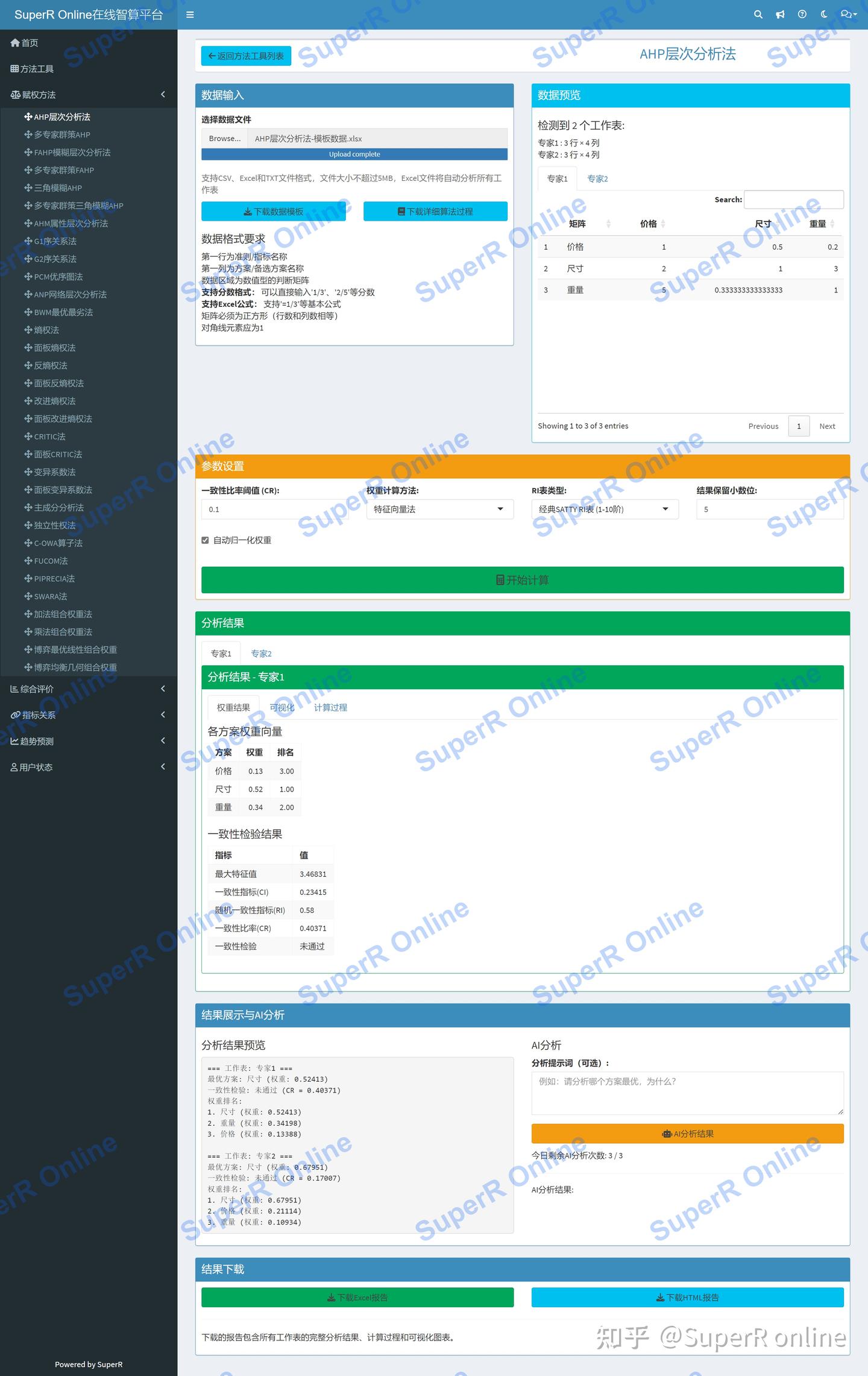 AHP层次分析法SuperR Online在线智算平台提供以下核心功能: