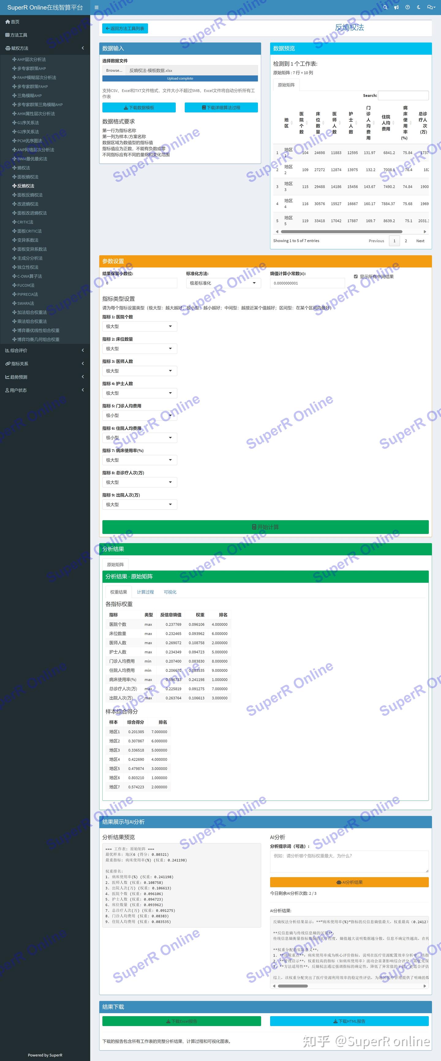 平台界面包含:数据上传区、参数设置区、多工作表预览、分析结果展示和AI分析模块