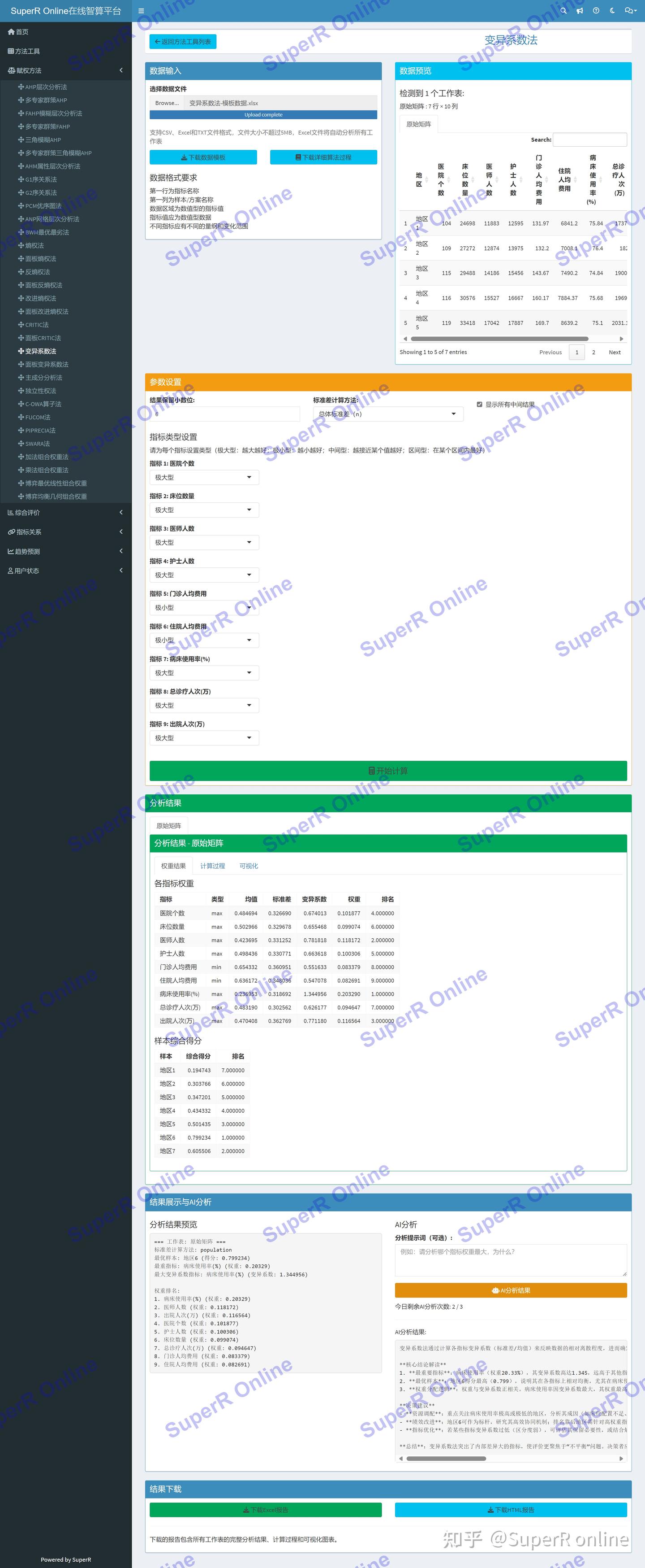 平台界面包含:数据上传区、参数设置区、多工作表预览、分析结果展示和AI分析模块