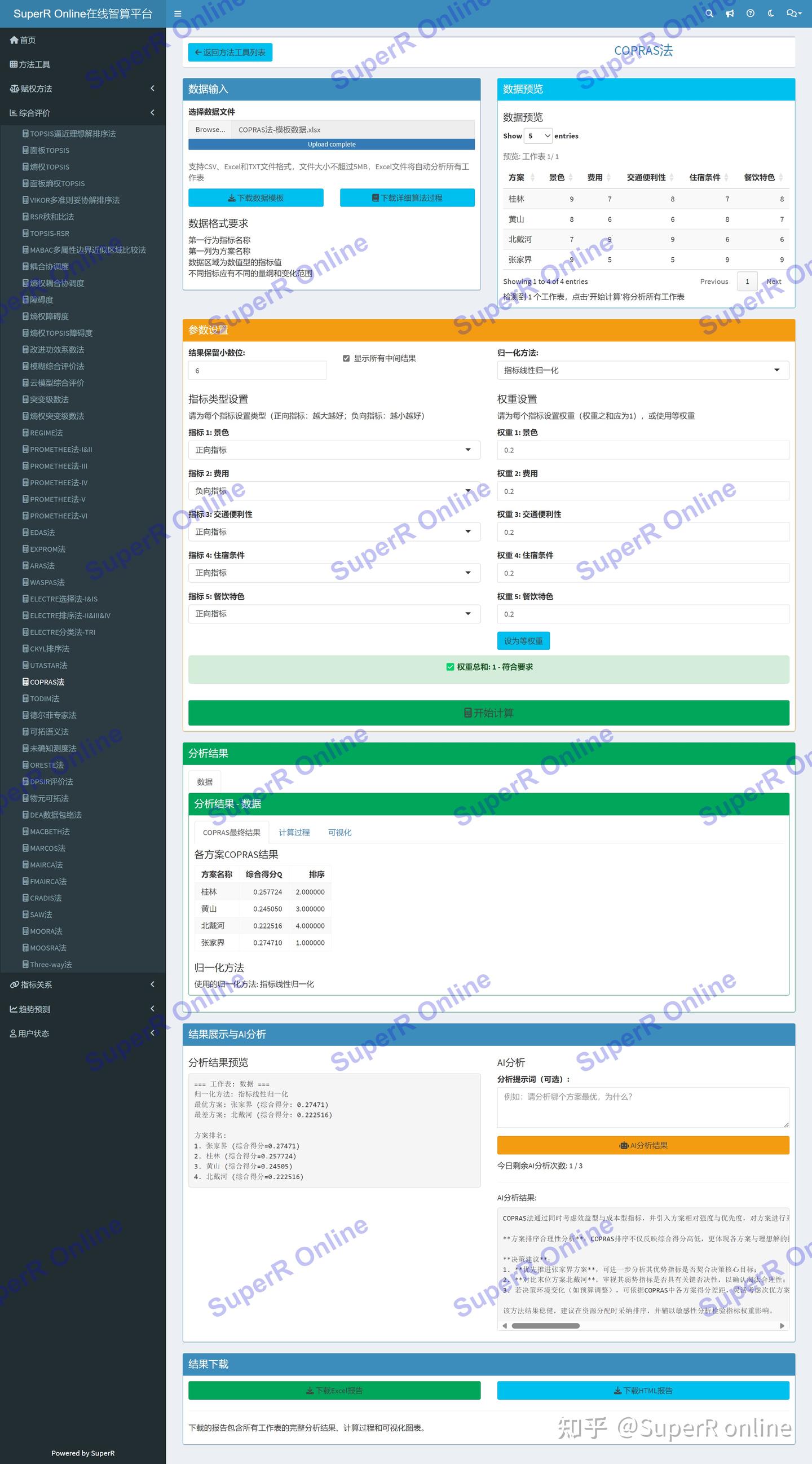COPRAS法要求对原始数据进行归一化,以消除量纲影响。本平台支持两种归一化方法,用户可根据需要选择。