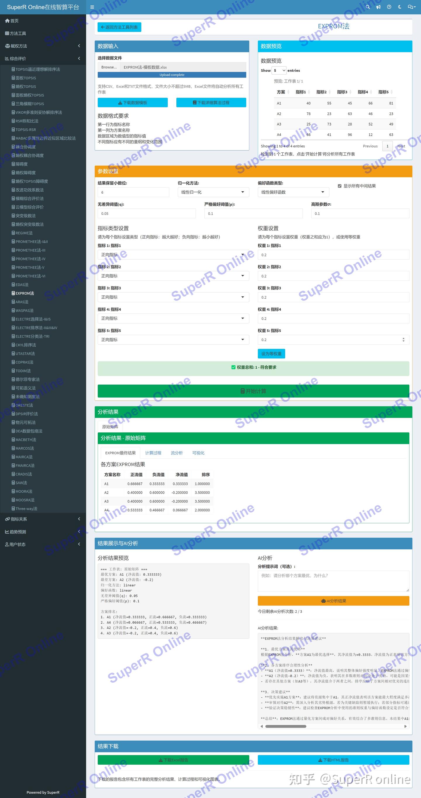 A: EXPROM法是PROMETHEE(偏好排序组织方法)的扩展或变体,核心思想相似,均基于偏好函数和流进行排序。不同之处可能在于归一化方式、偏好函数的具体形式或流的计算方法。本平台实现的EXPROM法包含多种偏好函数和归一化方法,具有较好的灵活性。