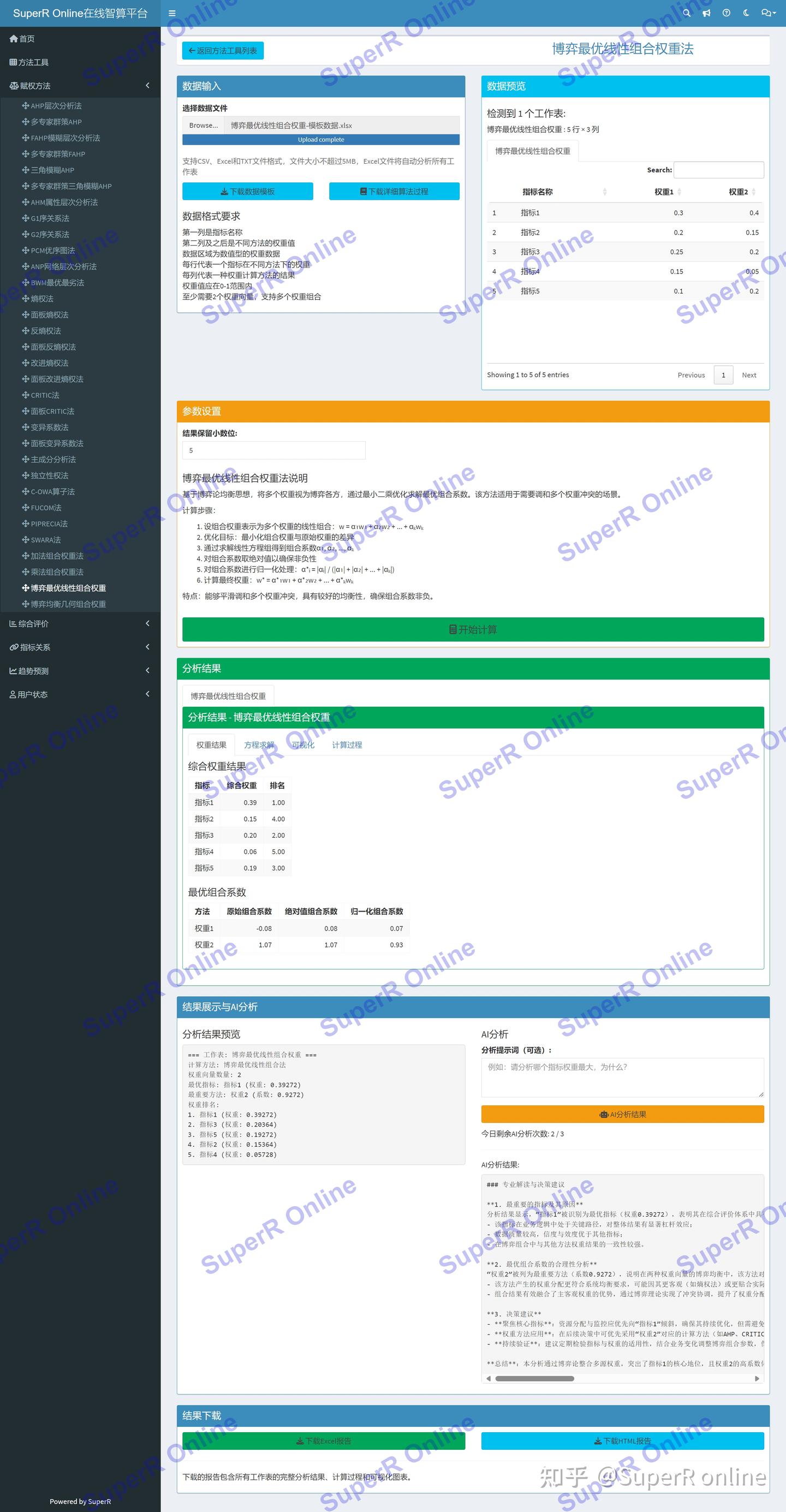博弈最优线性组合权重法分析平台提供以下核心功能: