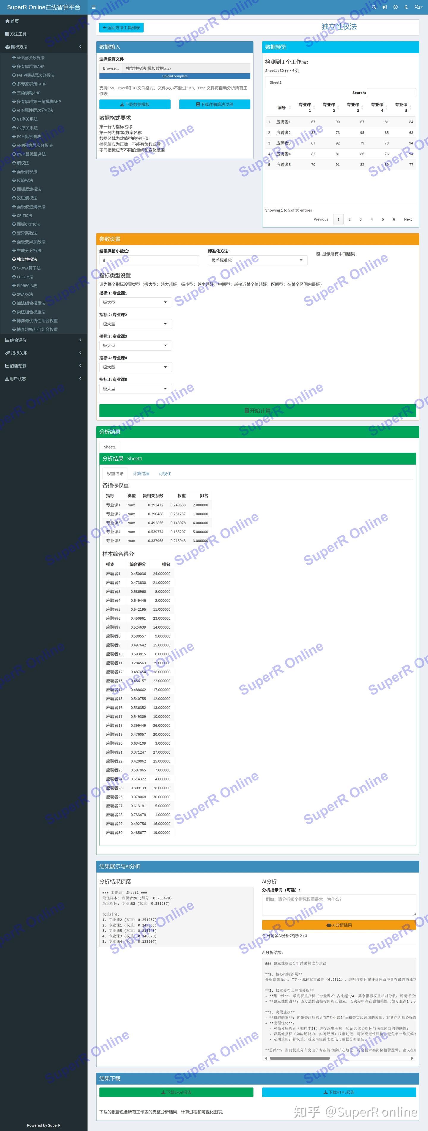 平台界面包含:数据上传区、参数设置区、多工作表预览、分析结果展示和AI分析模块