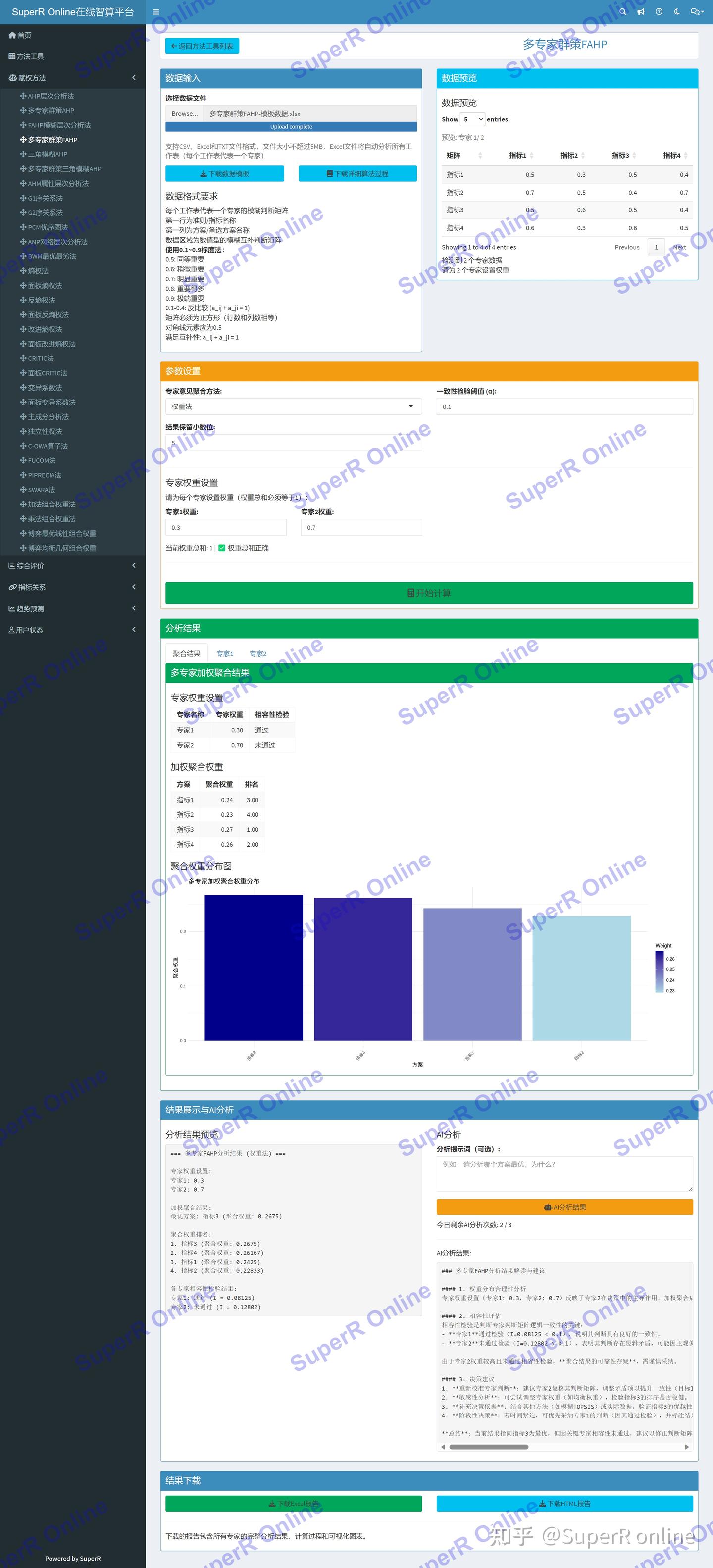 平台界面包含:数据上传区、参数设置区、专家权重配置、多工作表预览、分析结果展示和AI分析模块