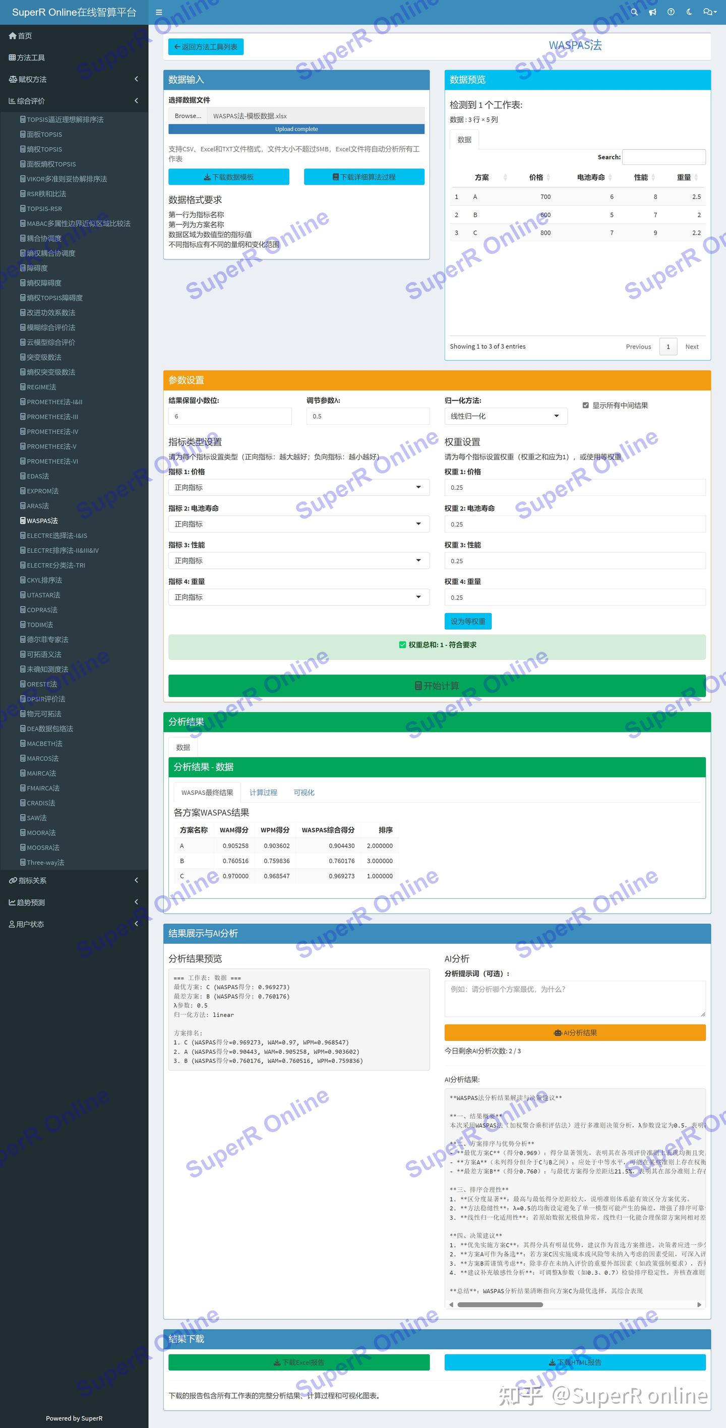 - 详细分析报告:包含每个工作表的 WASPAS 综合得分、排序、WAM 得分、WPM 得分、原始数据、归一化矩阵、指标权重。